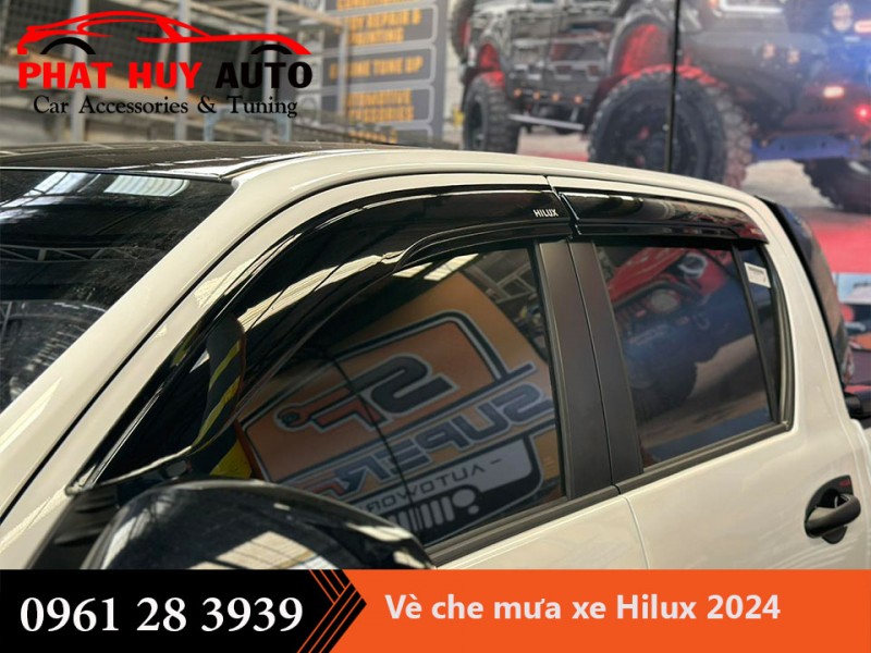 Vè che mưa Toyota Hilux 2024 là phụ kiện được lắp ở viền mép trên của cửa kính xe ô tô. Tác dụng chính của vè che mưa là làm đổi hướng các luồng gió chạy dọc thân xe, tránh mưa hất vào trong nội thất xe ô tô nếu kính hạ.